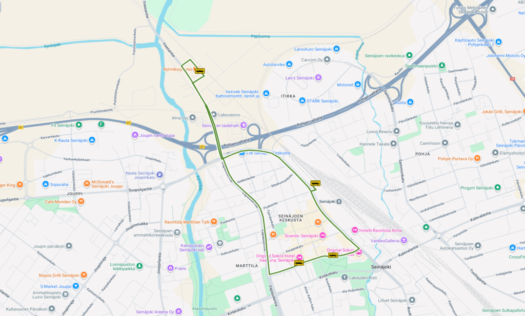 Matkakeskus 22:00 – Torikatu (Karma) – Rytmikorjaamo – Matkakeskus 22:30